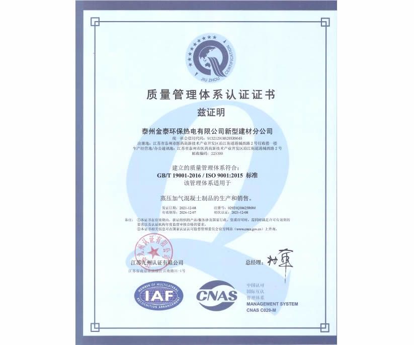 质量管理体系认证证书